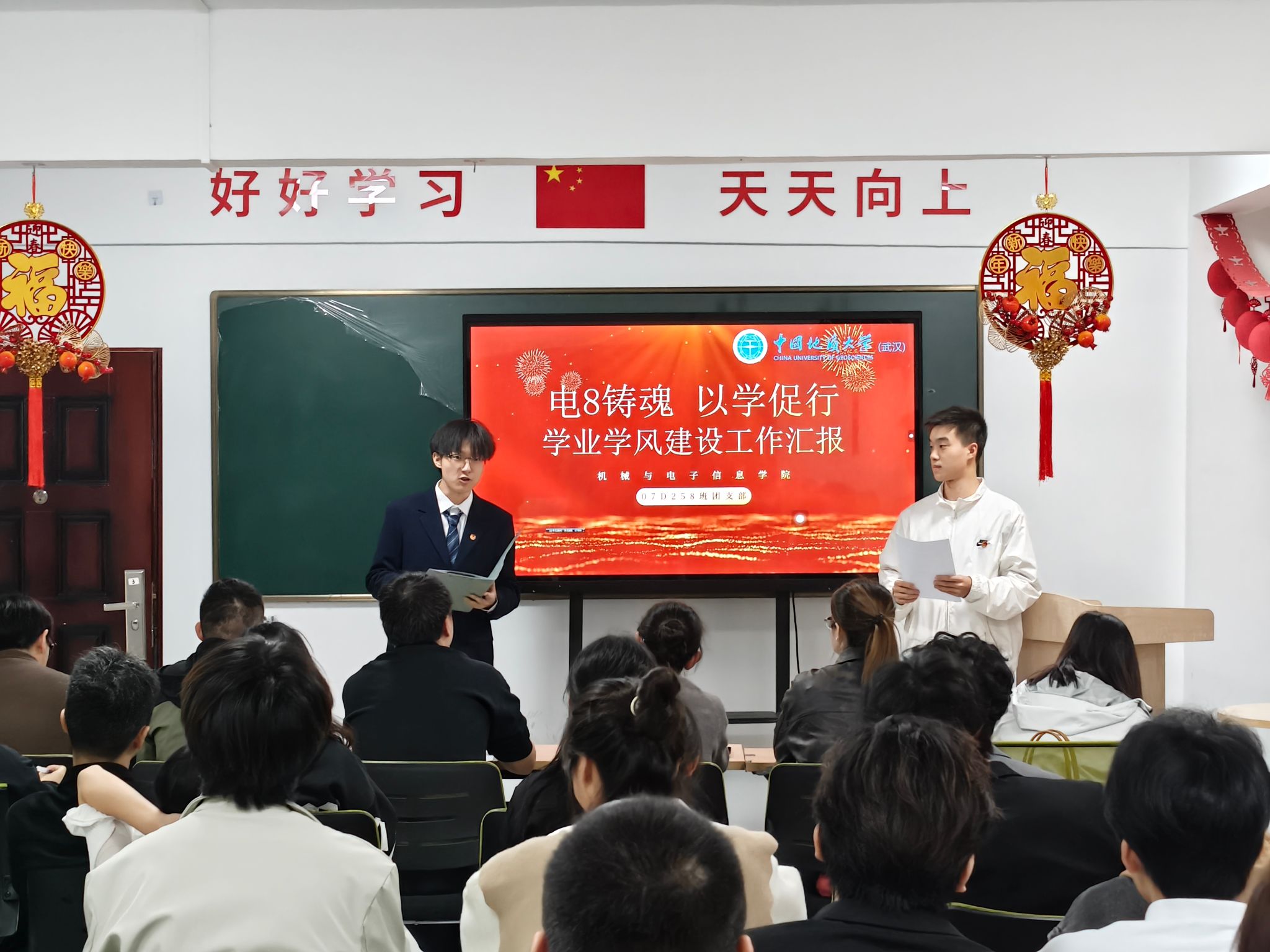 去年秋季学期以来,机电团委基于学院特点和工作布局,整合工作力量,面向学院2025级全体团支部大力推行“团支部特色发展套餐”,推动团支部围绕学业强基、科技创新、志愿服务、职业发展四大主题,制定支部特色建设“一年规划”——自设指标、过程监督、逐步推进,在每月一次的团会中设置专门研讨环节,做好回头看、定政策、抓落实。一学期以来,支部特色发展建设工作成效显著,形成月月有主题、支部有品牌、团员齐参与的良好氛围,支部组织力、引领力、服务力全面提升,基层团支部育人活力得到充分彰显。07D255团支部团支书郝艺博表示,“特色发展套餐让支部工作有方向、有抓手、有成效,让团支部真正成为凝聚青年、服务青年的坚强堡垒。”07D254团支部成员茅文俊谈到,“在支部特色活动中,大家归属感更强、参与感更足,在实践中收获成长、在协作中凝聚力量。”